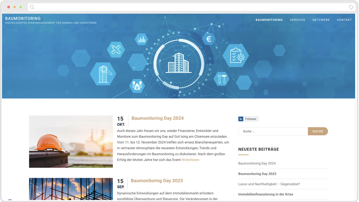 Baumonitoring.com is a network consisting of project developers, financiers, and real estate service providers. The platform serves as a forum for the exchange of relevant information and the organization of industry-specific events.