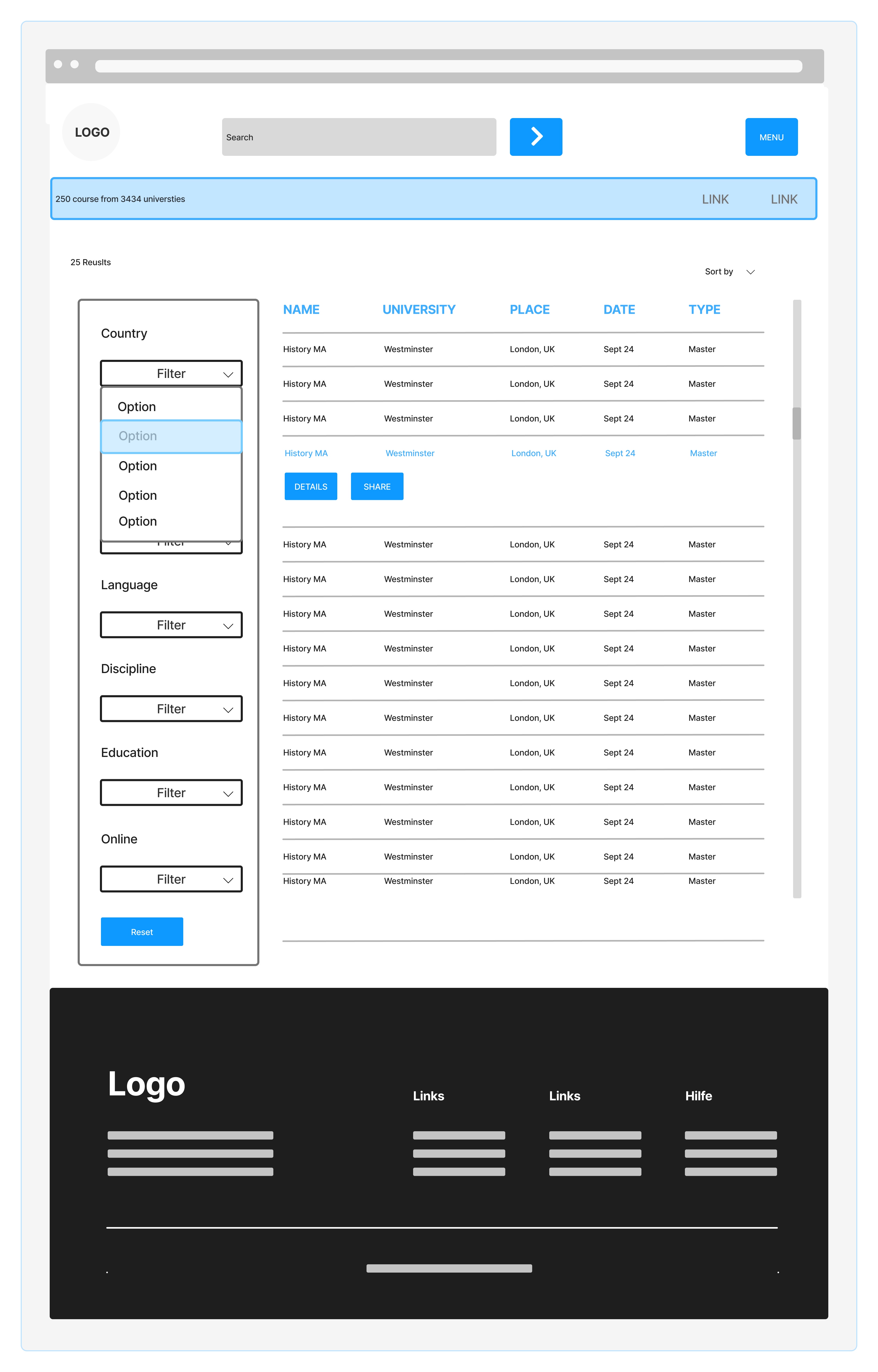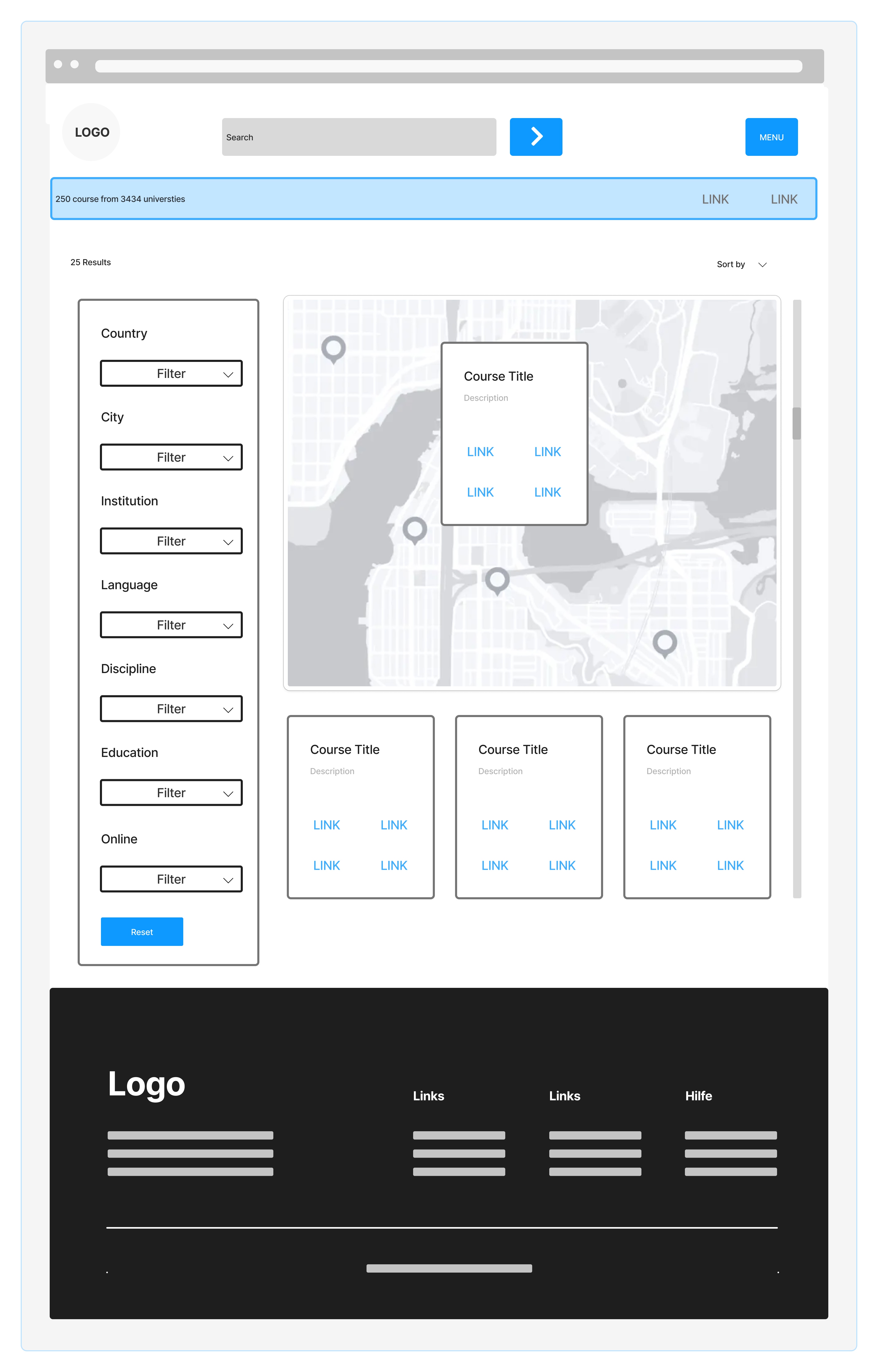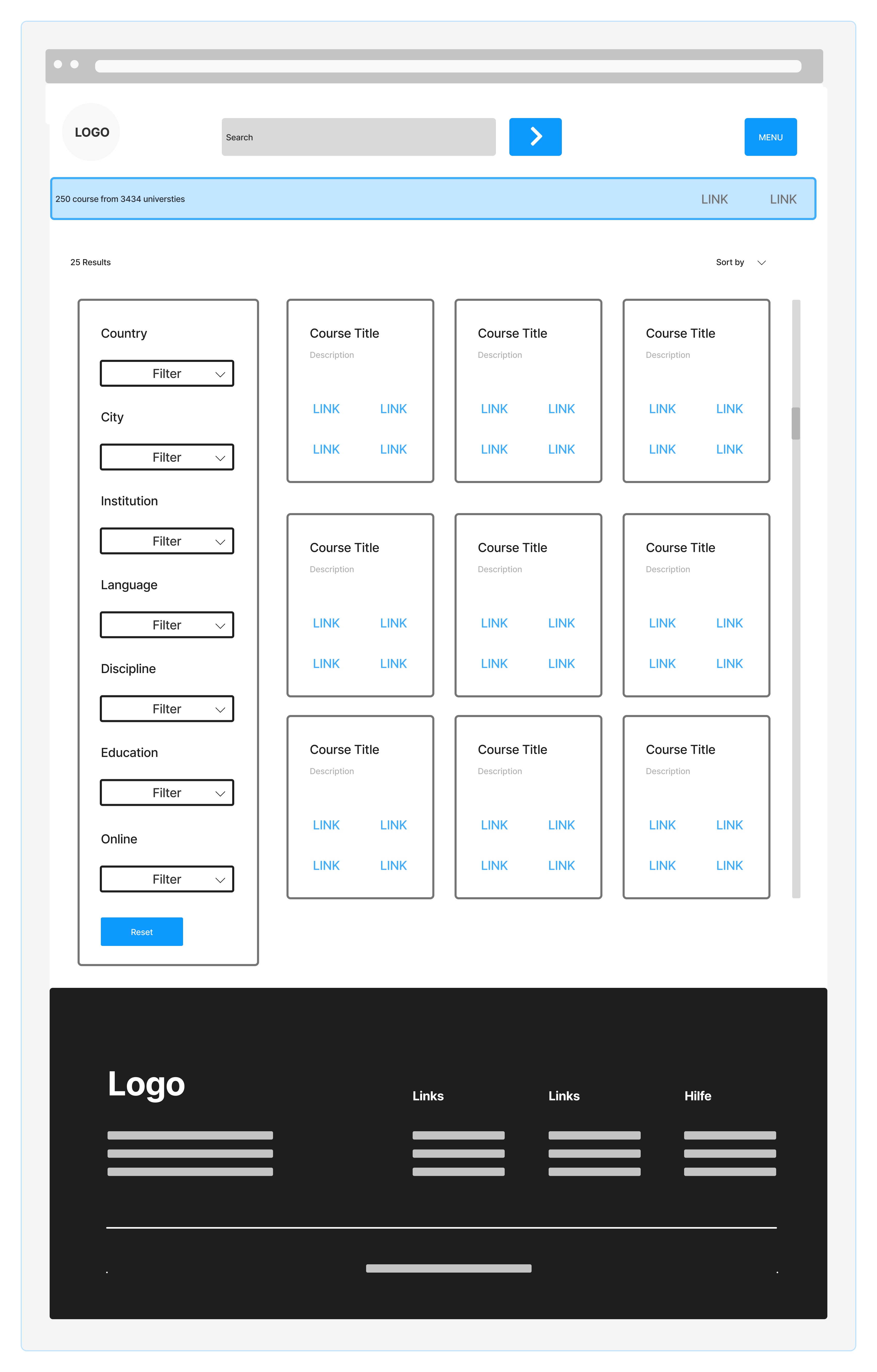 The challenge was to improve the current web search interface und thereby improving the user flow across the website. Through recent survey and user feedback it had become apparent that students often don't find what they were looking for and that the filtering and sorting option weren't clear to use. Another task was to provide the layout for a mobile version of the site especially the search part , which wasn't developed at all.