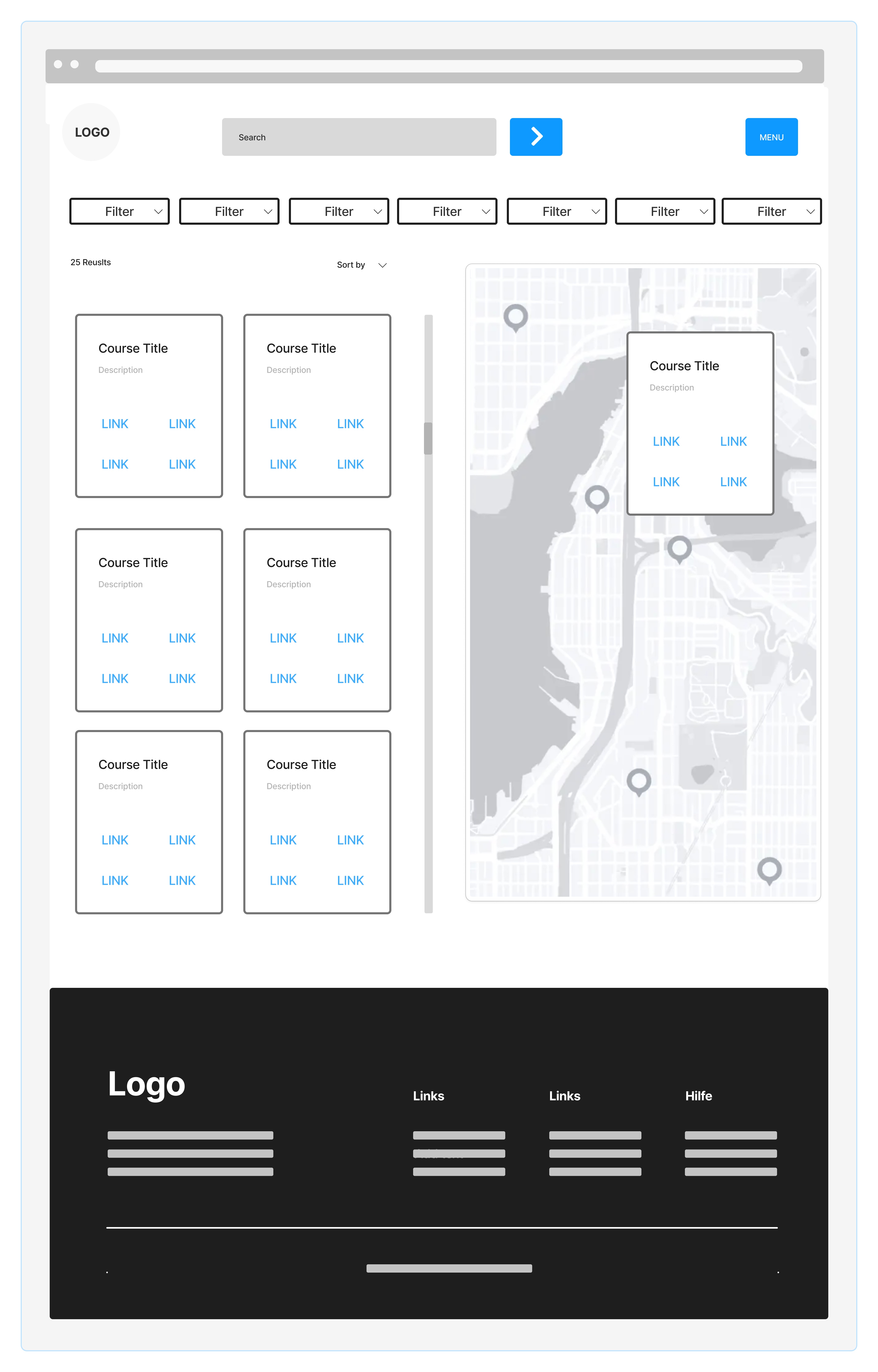 Based on my research, I figured that I needed to streamline the actual purpose of this website , which is to allow users to find the right course in the desired location. At the same time it was necessary to make sure filters were prominent at all time, the mobile site is on point and that a high level of accessibility is given.