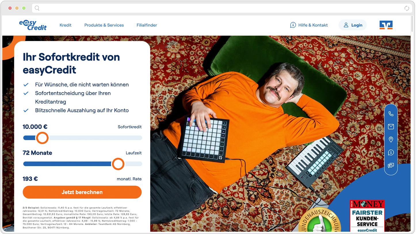 With easyCredit as its main product, TeamBank AG is an expert for liquidity management in the Volksbanken Raiffeisenbanken cooperative financial network. They offer Germany's most recognized online credit for loans up to 100k.