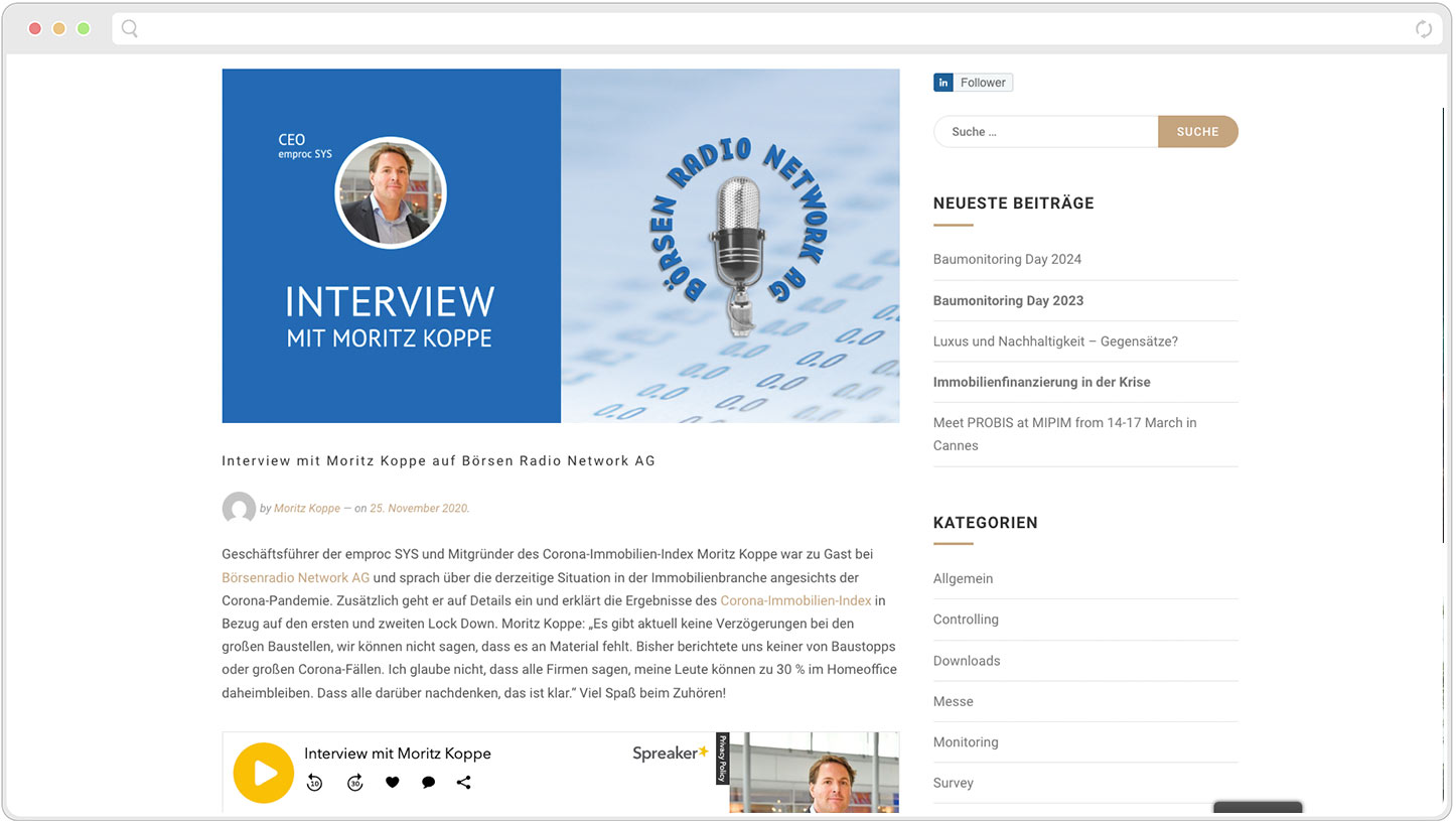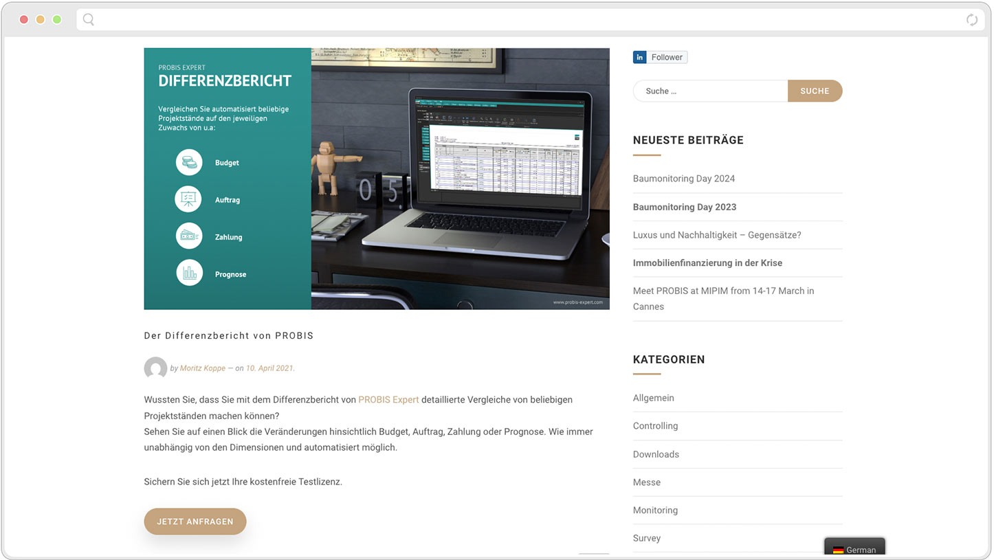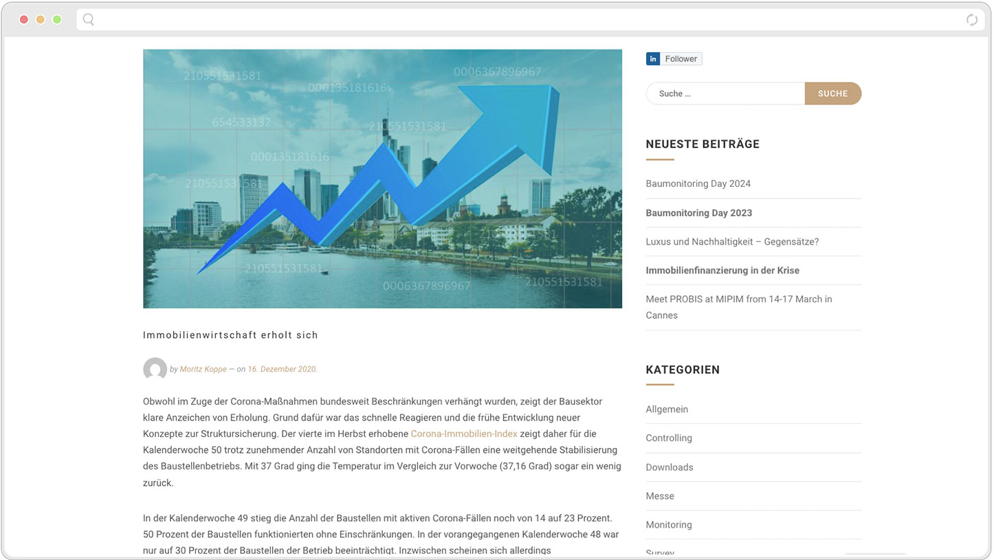 Baumonitoring.com is a network consisting of project developers, financiers, and real estate service providers. The platform serves as a forum for the exchange of relevant information and the organization of industry-specific events.