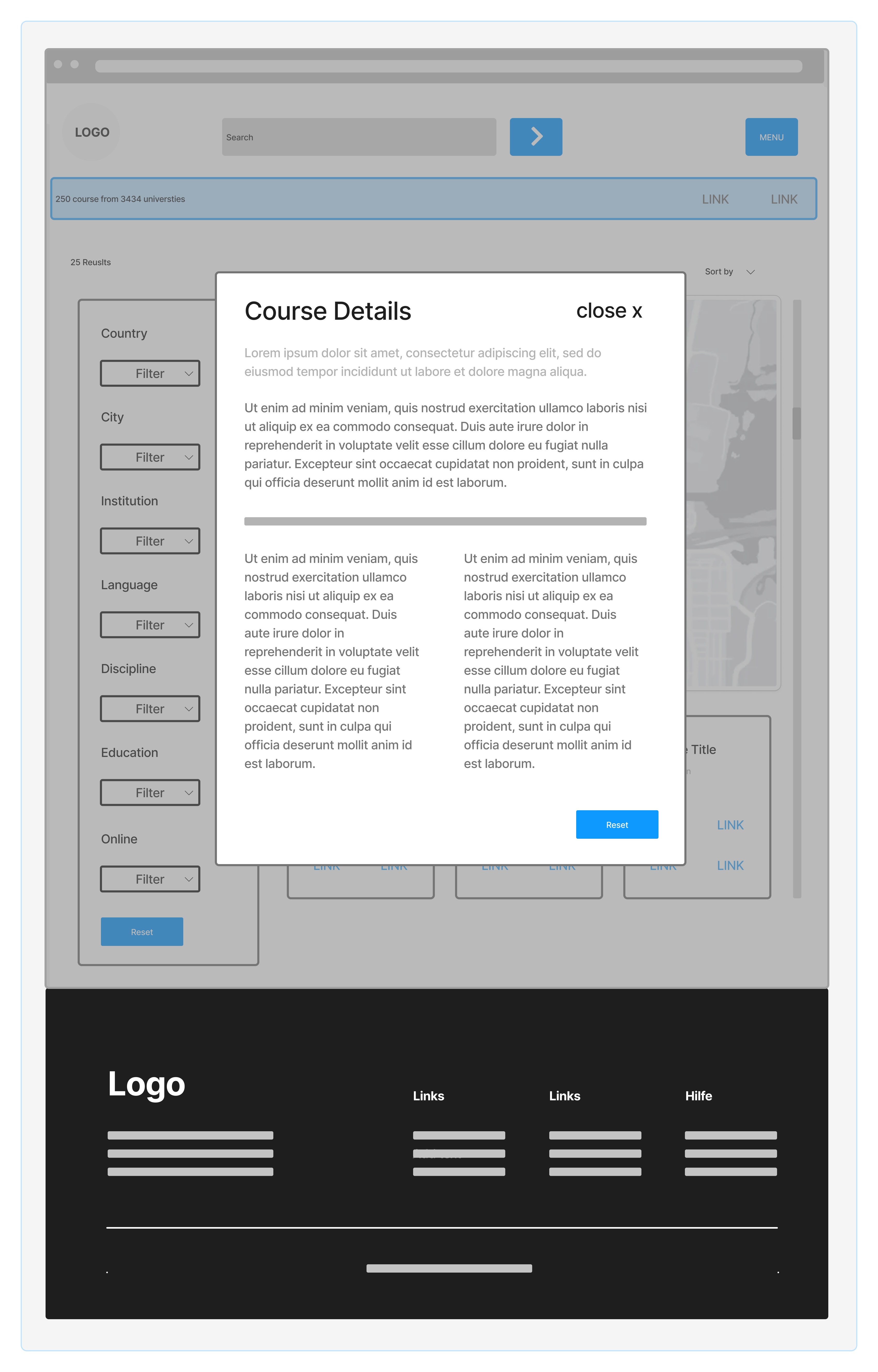 The challenge was to improve the current web search interface und thereby improving the user flow across the website. Through recent survey and user feedback it had become apparent that students often don't find what they were looking for and that the filtering and sorting option weren't clear to use. Another task was to provide the layout for a mobile version of the site especially the search part , which wasn't developed at all.