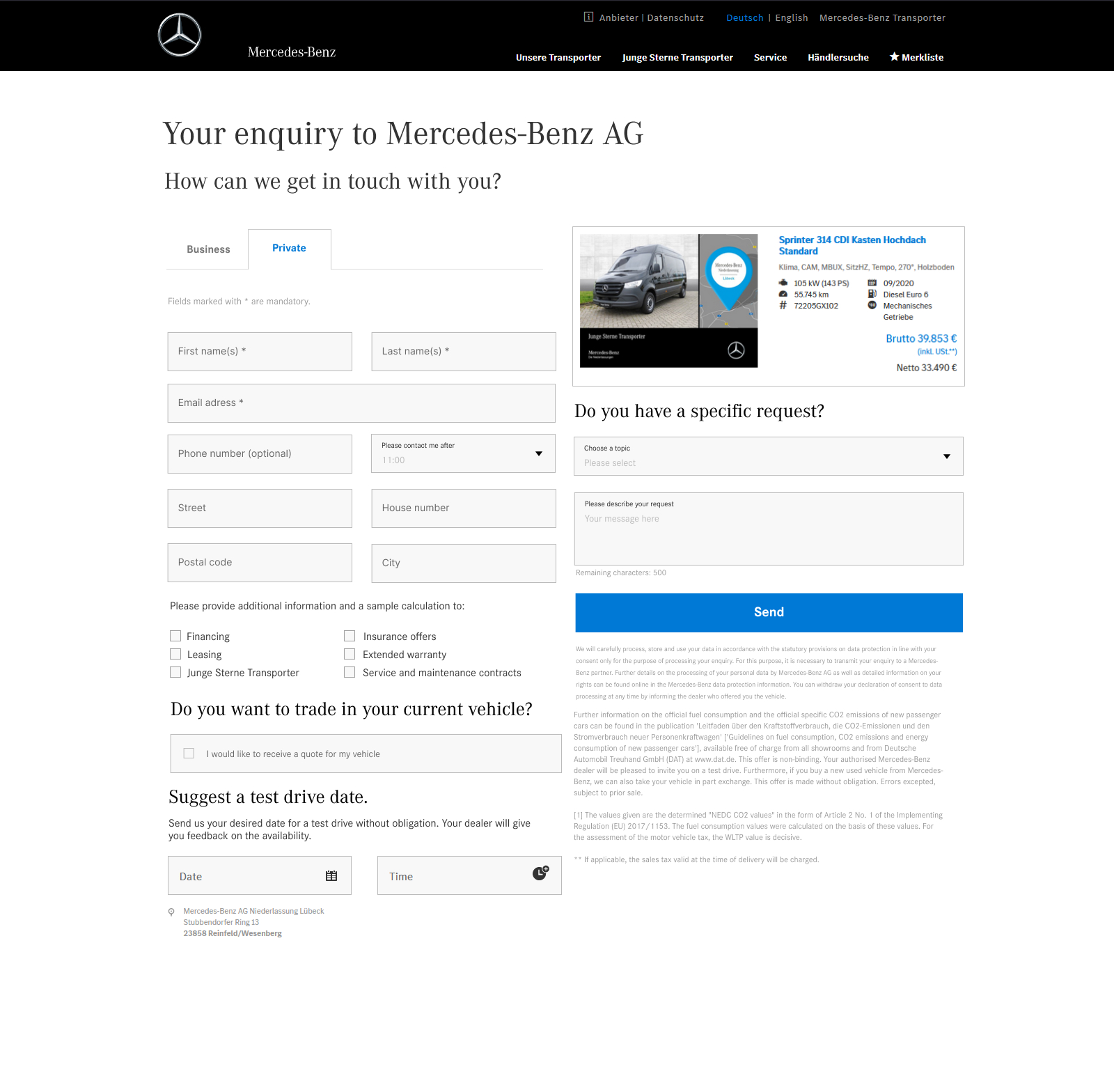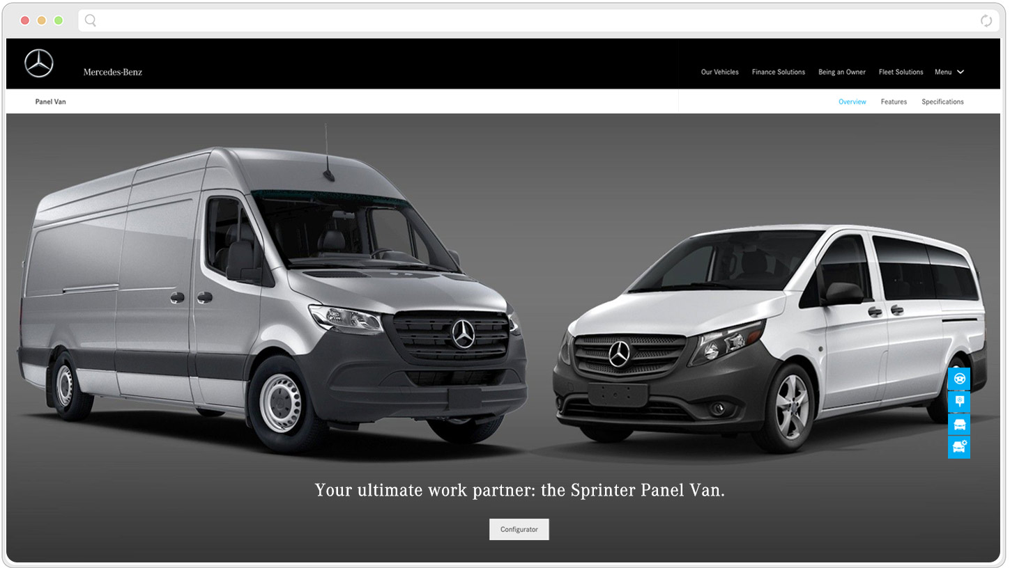 Mercedes-Benz Vans is the Mercedes-Benz AG division for vans of the Mercedes-Benz brand. Besides the day to day van sales and configurations they also have a B2B portal, where business owners can rent, buy and finance vans.